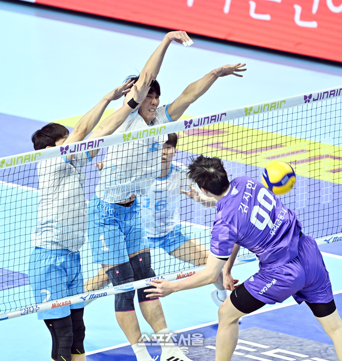 대한항공 김규민(가운데)이 10일 인천 계양체육관에서 열린 2025-2026 V리그 남자부 우리카드와 경기에서 우리카드 김지한의 공격을 블로킹 하고 있다. 2026. 2. 10.