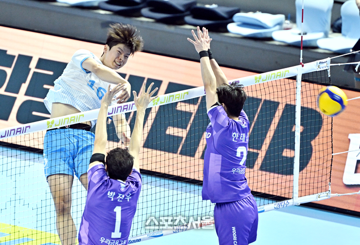 대한항공 정한용(왼쪽)이 10일 인천 계양체육관에서 열린 2025-2026 V리그 남자부 우리카드와 경기에서 스파이크 공격을 하고 있다. 2026. 2. 10.