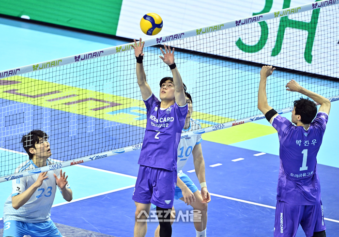 우리카드 세터 한태준(가운데)이 10일 인천 계양체육관에서 열린 2025-2026 V리그 남자부 대한항공과 경기에서 토스를 올리고 있다. 2026. 2. 10.