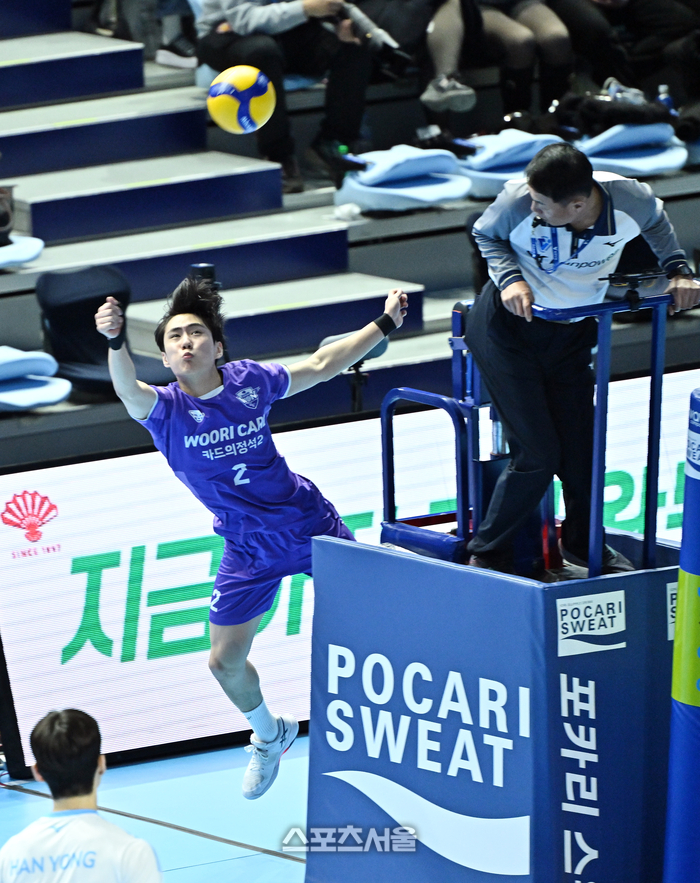 우리카드 세터 한태준(왼쪽)이 10일 인천 계양체육관에서 열린 2025-2026 V리그 남자부 대한항공과 경기에서 주심 뒤로 떨어지는 공을 살려내고 있다. 2026. 2. 10.