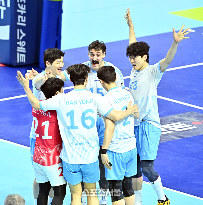 대한항공 선수들이 10일 인천 계양체육관에서 열린 2025-2026 V리그 남자부 우리카드와 경기에서 득점을 한 뒤 함께 기뻐하고 있다. 2026. 2. 10.