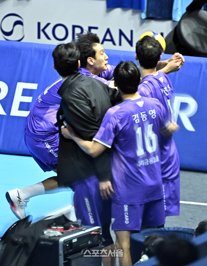 우리카드 한성정이 10일 인천 계양체육관에서 열린 2025-2026 V리그 남자부 대한항공과 경기에서 웜업존까지 달려가 공을 살려내고 있다. 2026. 2. 10.