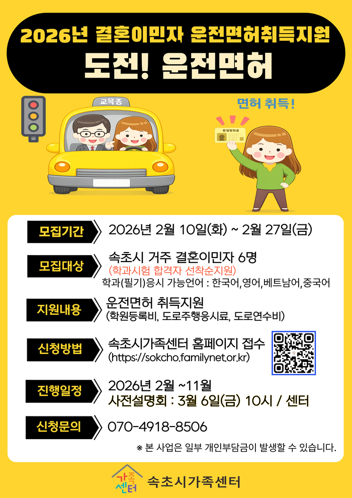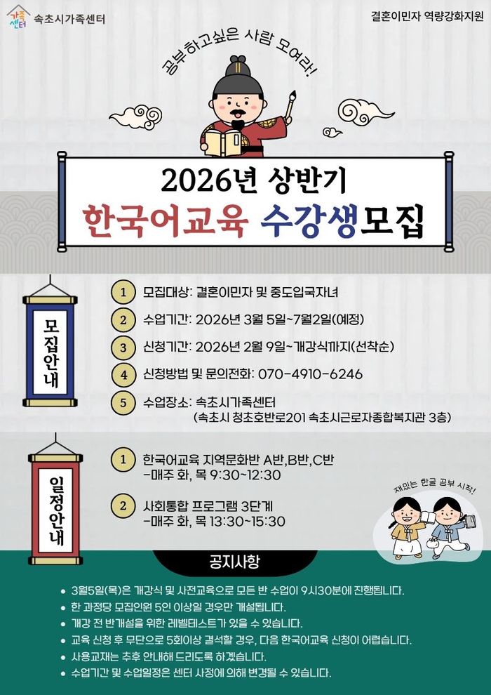 두 교육과 관련된 문의는 속초시가족센터(한국어 교육 070-4910-6246 / 운전면허 취득 지원사업 070-4918-8506)로 하면 된다.