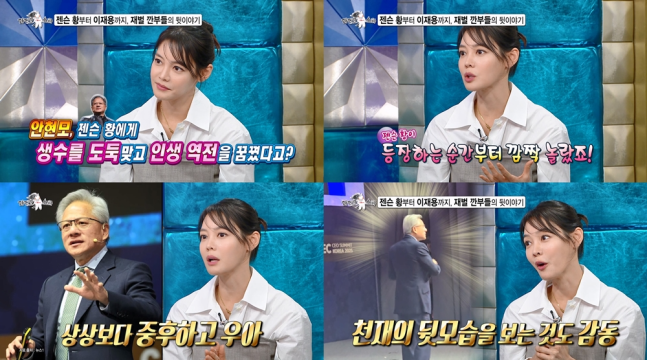 MC 김구라가 “젠슨 황에게 생수를 도둑맞고 인생 역전을 꿈꿨다고?”라고 묻자 안현모는 웃으며 “엔비디아 CEO 젠슨 황이 등장하는 순간부터 깜짝 놀랐다”며 프롬프터 없이 40분 넘게 연설하는 모습을 보고 “천재의 앞모습도 신기했지만 뒷모습도 감동이었다”고 말했다.