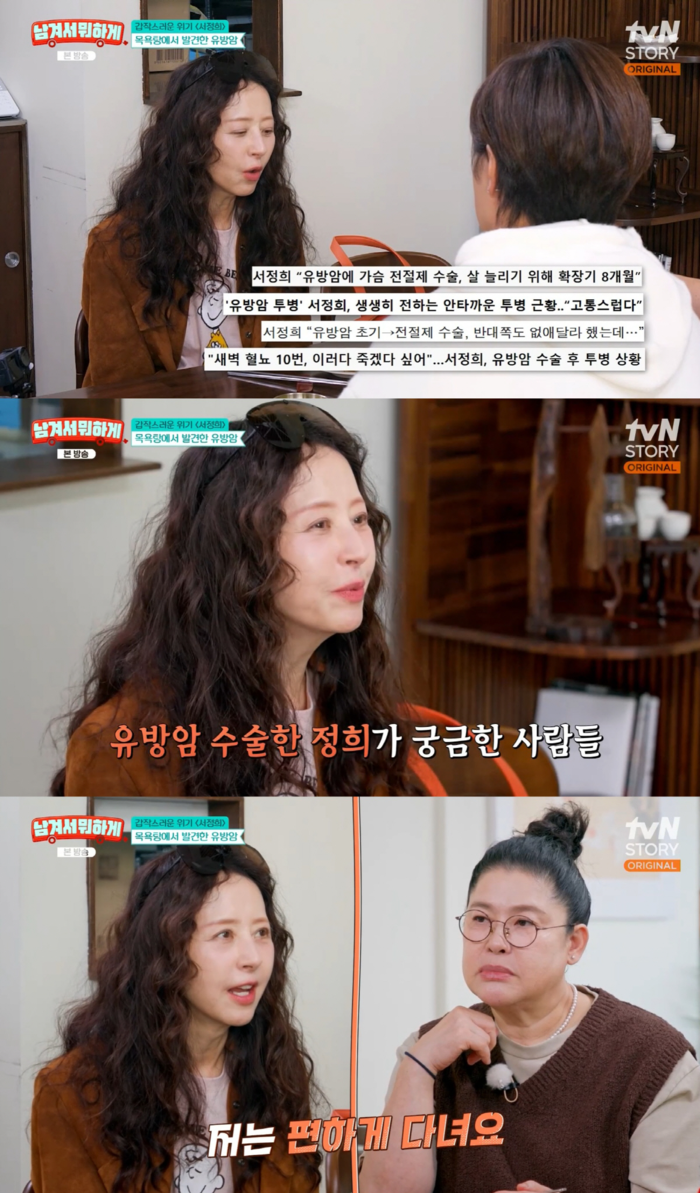 이영자가 “지금도 대중목욕탕에 가느냐”고 묻자 서정희는 “그럼요. 유방암 수술하고도 지금도 간다”고 답했다. 그는 “사람들이 나를 쳐다보고 수군거리기도 한다. 그럼 그냥 ‘서정희예요’라고 한다”고 말해 주위를 놀라게 했다.