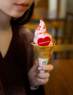 메뉴가 딸기아이스크림이라는 점에 시선이 쏠린다. 백미당은 유기농 우유와 제철과일인 설향딸기로 아이스크림을 만들었다. 동결건조한 딸기를 토핑으로 얹었다. 새콤달콤하다. 1월에 출시한 시즌 한정 상품이다.