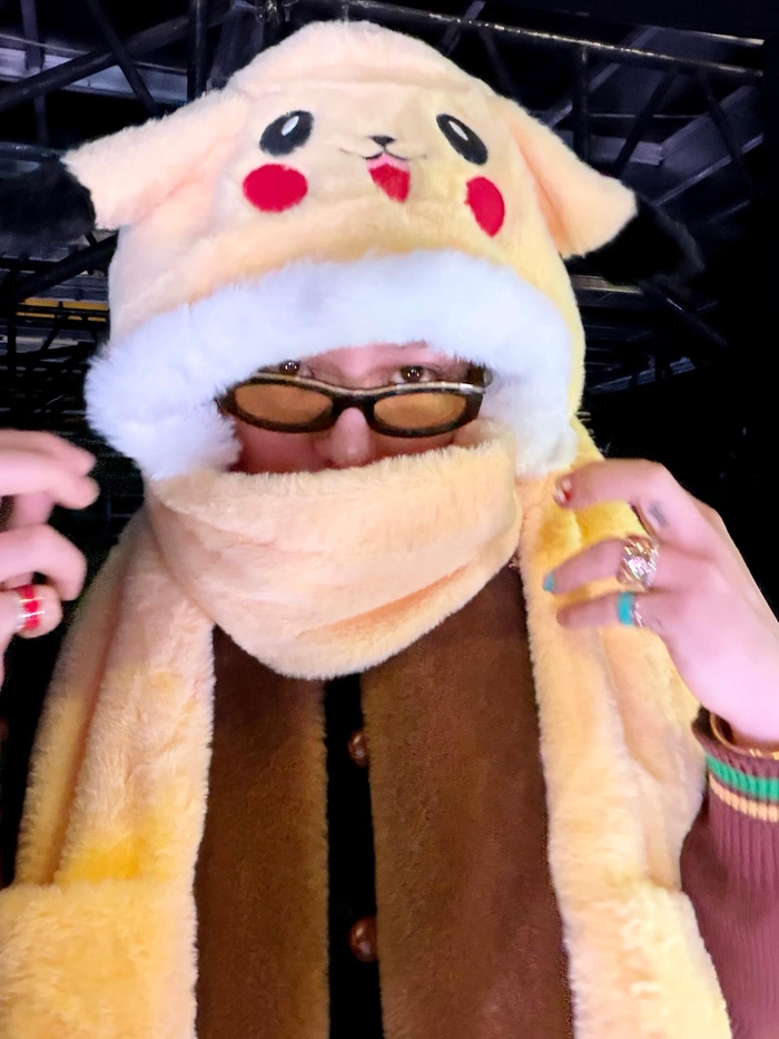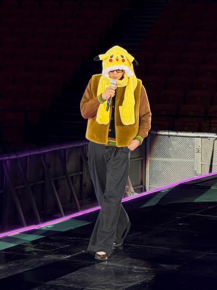 노란색 피카츄 모자를 깊게 눌러쓴 채 마이크를 잡고 있는 모습은 카리스마 넘치는 무대 위 모습과 대비되는 반전 매력을 선사한다.