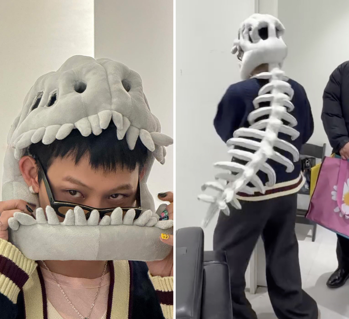 또 다른 사진에서는 공룡 뼈 모양의 대형 인형 모자를 착용한 채 장난기 가득한 포즈를 취하고 있다. 특히 영상 속에서는 등 뒤로 길게 늘어진 인형 꼬리를 흔들며 걷는 뒷모습이 포착되어 지드래곤만의 소년미 넘치는 감성을 자아냈다.