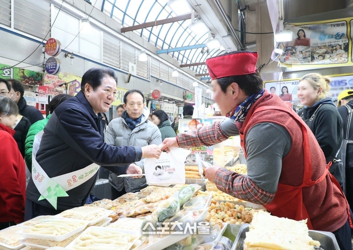 〔스포츠서울│안양=좌승훈기자〕최대호 안양시장은 설을 앞두고 11일 중앙시장과 박달시장, 12일 남부시·호계·관양시장을 방문해 각 점포를 돌며 명절 물가동향을 살폈다.