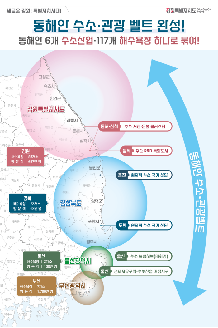 또한 “강릉‧동해‧삼척 13개 특구 개발사업 3조원과 연계한 시너지 효과는 물론, 울산‧경북‧강원에 분산된 6개 주요 수소거점을 연결하는 수소산업 벨트와 동해안 117개 해수욕장을 기반으로 한 글로벌 관광벨트 조성에도 중요한 역할을 할 것”이라고 덧붙였다.