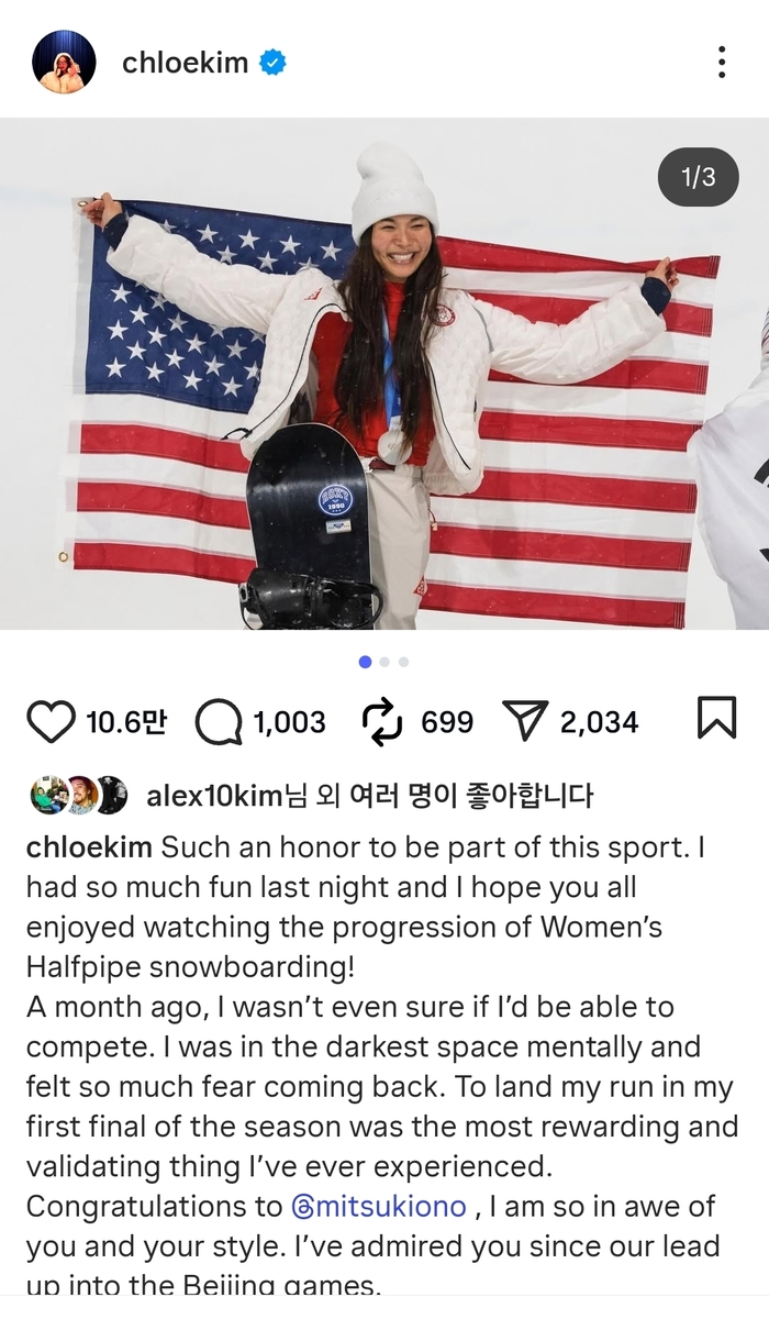 앞서 클로이 김은 ‘한 달 전 나는 내가 (올림픽에서) 경쟁할 수 있을지 확신하지 못했다. 정신적으로 어두운 공간에 있었고 너무 많은 두려움을 느꼈다’며 ‘내가 경험한 것 중 가장 보람 있고 검증된 일이었다’고 적었다.