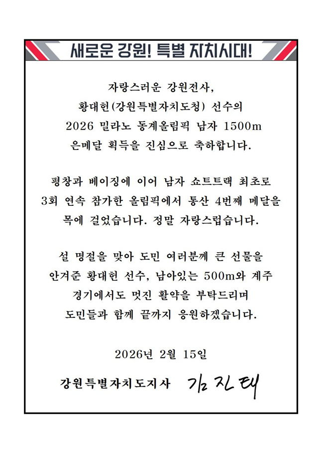 [스포츠서울ㅣ춘천=김기원기자]김진태 강원특별자치도지사는 15일 2026 밀라노-코르티나담페초 동계올림픽대회 남자 쇼트트랙 1,500m에서 은메달을 획득한 강원특별자치도 소속 국가대표 황대헌 선수에게 축전을 보내 축하했다.