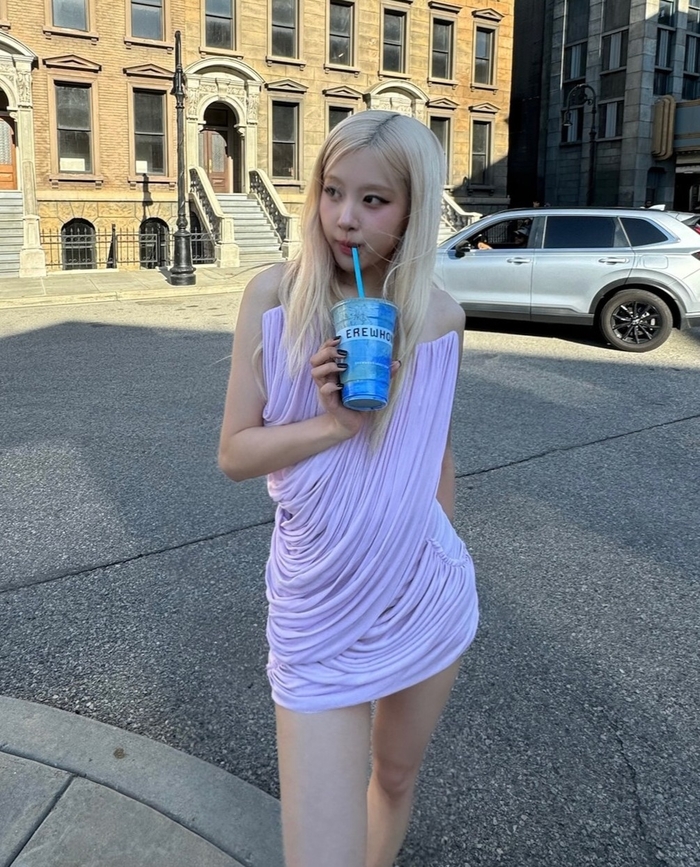 로제는 15일 자신의 사회관계망서비스에 여러 장의 사진을 게시했다. 공개된 사진 속 로제는 연보라색 드레이프 미니 드레스를 입고 세련된 매력을 뽐내고 있다.