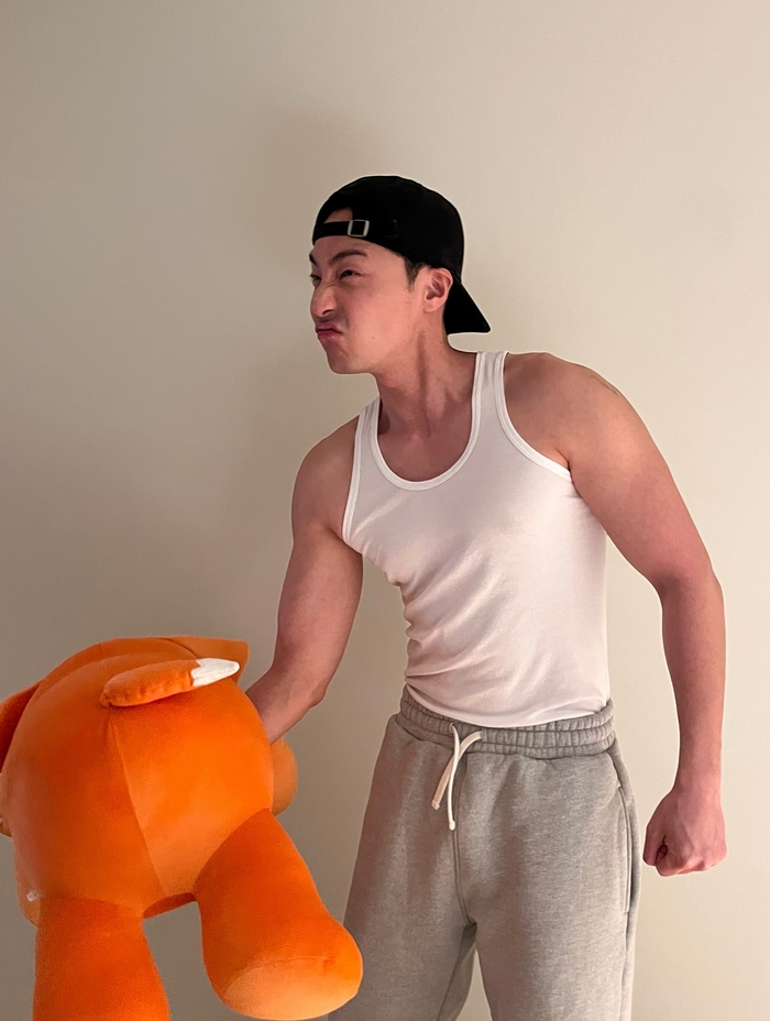 또한 그는 성난 팔 근육을 자랑하며 ‘록스’를 번쩍 들어 올리거나 거꾸로 든 채 장난스러운 표정을 짓고 있어 인형이 순식간에 ‘아령’으로 변신한 진풍경을 연출했다.