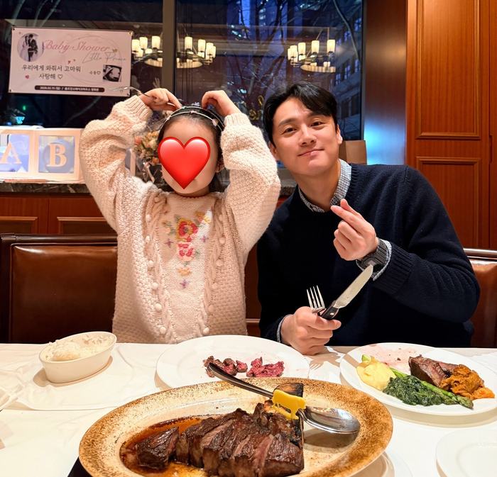 현장은 ‘Hello Baby’ 풍선과 아기 모양 대형 풍선으로 장식되어 따뜻한 분위기를 자아냈다. 함께 자리한 첫째 딸은 아빠와 함께 손가락 하트를 만들며 엄마의 순산을 기원하는 모습으로 훈훈함을 더했다.