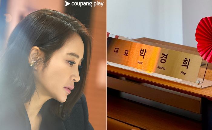 고급스러운 골드 명패에는 ‘대표 박경희’라는 문구가 선명하게 새겨져 있어, 극 중 인테리어 기업을 이끄는 CEO이자 모두의 워너비인 인플루언서로서의 당당한 캐릭터 설정을 엿보게 한다. 특히 명패 옆에 놓인 붉은색 소품은 주인공 경희의 뜨거운 욕망과 화려한 삶을 상징하는 듯해 묘한 긴장감마저 자아낸다.