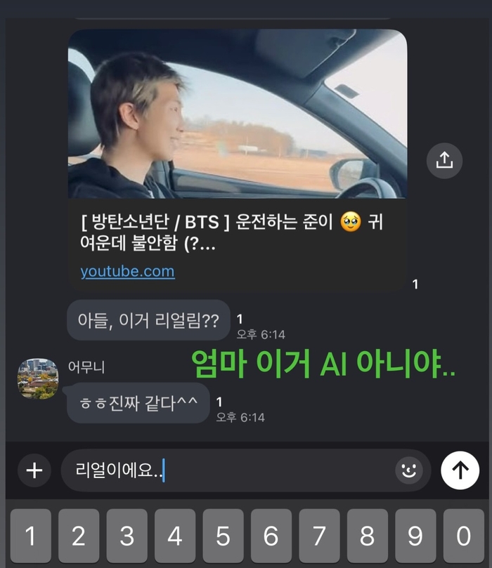 그동안 RM은 방탄소년단 멤버 중 유일하게 운전면허가 없는 것으로 유명했기에, 실제로 운전하는 모습이 담긴 영상을 본 어머니조차 이를 인공지능(AI) 기술로 만든 가짜 영상으로 의심한 것이다. 이에 RM은 “엄마 이거 AI 아니야..”, “리얼이에요..”라고 답하며 해당 영상이 실제 상황임을 직접 확인시켜 주었다.