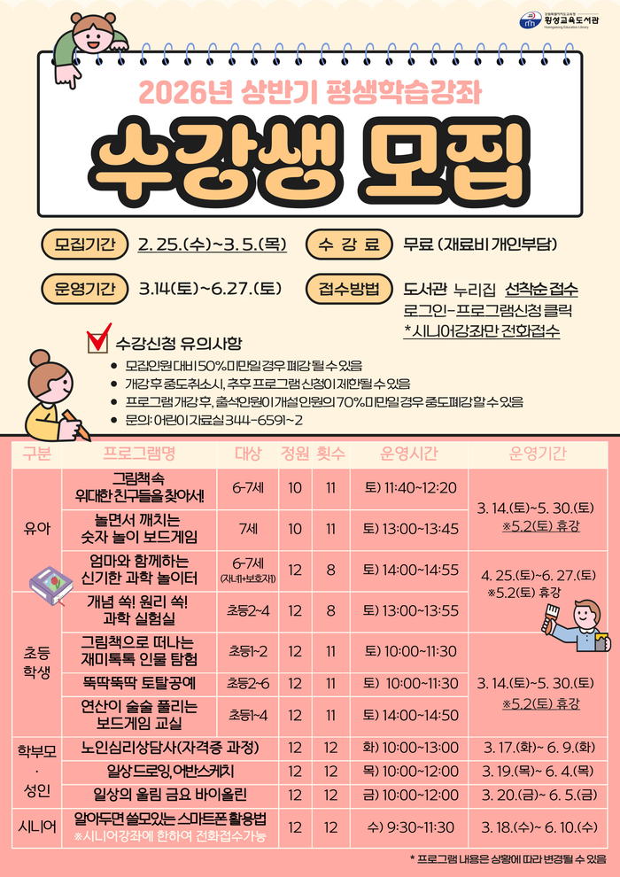 [스포츠서울ㅣ김기원기자]강원특별자치도교육청 횡성교육도서관(관장 권정애)은 지역 학생과 주민에게 다양한 문화예술 활동의 기회를 제공하고자 3월 14일(토)부터 6월 27일(토)까지 ‘2026년 상반기 평생학습강좌’를 운영한다.