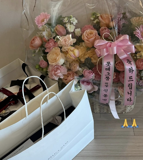 최가온은 17일 자신의 소셜 미디어에 신 회장에게 받은 화환과 선물 사진을 공개했다. 화환에는 ‘축하드립니다, 롯데그룹 회장 신동빈’이라고 적혀 있다. 선물은 롯데호텔의 프리미엄 베이커리 델리카한스의 케이크로 추정된다.