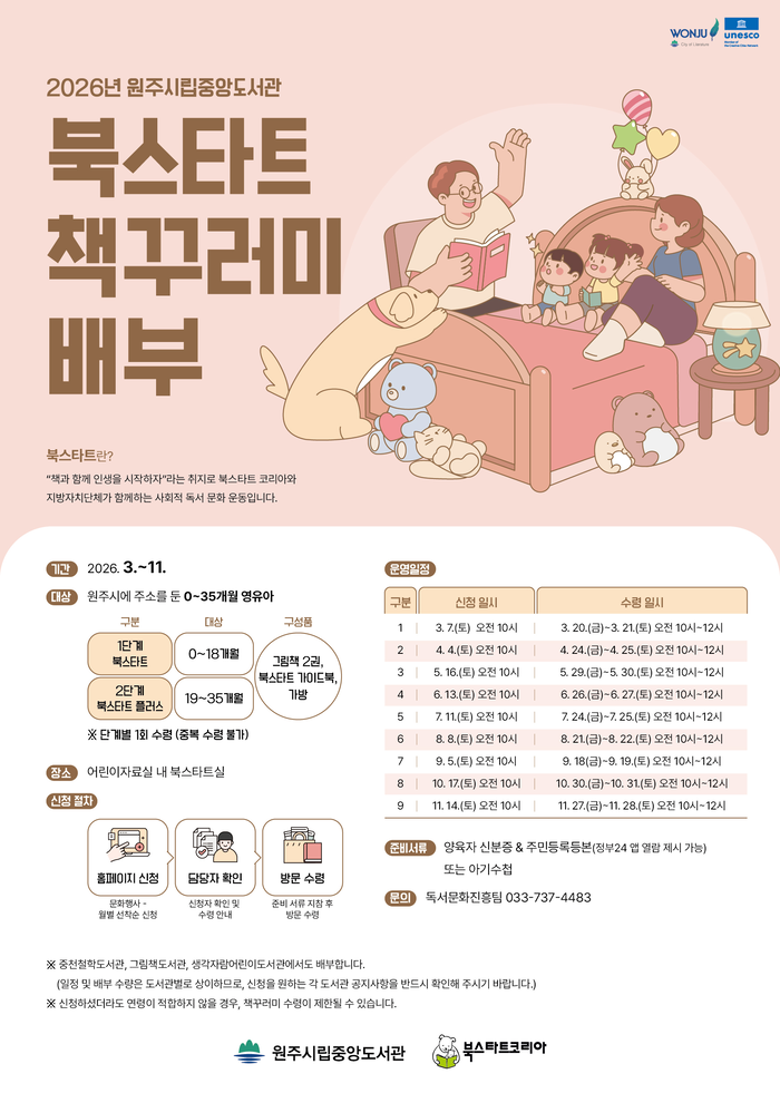 [스포츠서울ㅣ원주=김기원기자]원주시립중앙도서관은 영유아의 생애 초기 독서 경험을 지원하고 가정 내 책 읽는 문화를 확산하기 위해 ‘2026년 북스타트 책꾸러미 배부’ 사업을 추진한다.
