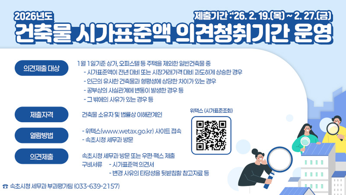 [스포츠서울ㅣ김기원기자]속초시는 2026년도 건축물 시가표준액(안)에 대해 건축물 소유자와 이해관계인(부동산 등기부에 기재된 권리자)을 대상으로 오는 2월 27일까지 의견청취기간을 운영한다.