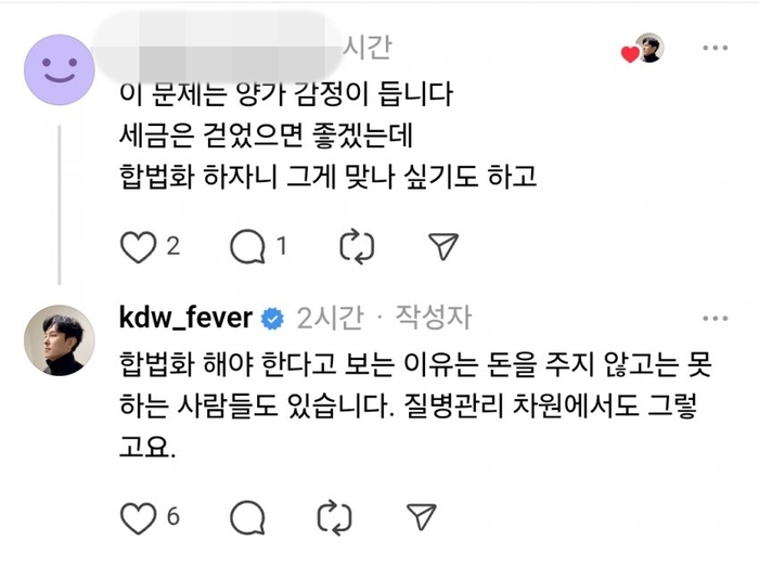 이에 한 네티즌이 공창제 도입을 통한 관리 필요성에 공감을 표하자, 김동완은 “조금 짧게 얘기해주겠느냐. 네 줄 정도로?”라고 답글을 남겼다. 또 다른 이용자가 “합법화가 맞는지 고민된다”는 반대 의견을 내놓자 그는 “돈을 주지 않고는 못 하는 사람들도 있다. 질병 관리 차원에서도 그렇다”며 합법화 필요성을 재차 언급한 것으로 전해졌다.