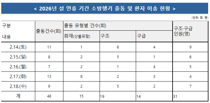 (운영 실적) 연휴 기간 소방헬기 활동 실적을 분석한 결과, 총 48건의 출동을 통해 31명을 병원 등으로 이송한 것으로 집계됐다. 활동 유형별로는 산악 구조 등 구조 출동이 19건으로 가장 많았으며, 화재 진화(산불 포함) 출동이 15건, 교통사고 및 급성 질환 등 구급 이송이 14건으로 뒤를 이었다.