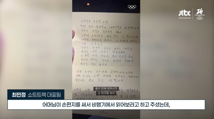 최민정의 은퇴 소식과 함께 그가 출국 전 어머니로부터 받은 편지 한 통이 다시금 회자되며 시청자들의 눈시울을 붉히고 있다. 어머니는 편지에서 “6살 때 스케이트를 처음 신던 작은 아이가 큰 무대에 서다니 그 자체로 기적 같다”며 “얼마나 참고, 버티고, 혼자 울었는지 엄마는 알고 있다”고 딸의 고통을 보듬었다.