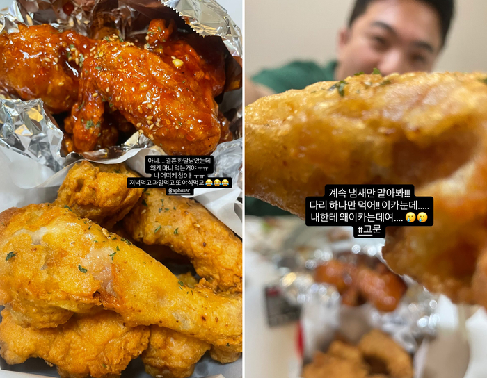공개된 사진 속에는 먹음직스러운 양념 치킨과 후라이드 치킨이 담겨 있어 보는 이들의 식욕을 자극한다.