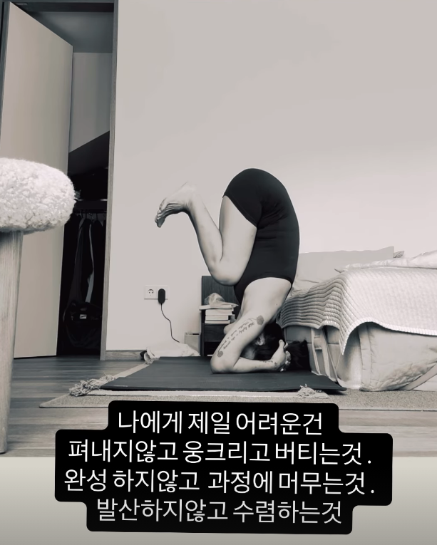특히 흑백으로 촬영된 영상에서는 고난도의 요가 동작인 머리서기 자세를 유지하며 진지하게 수련에 임하는 모습이 담겼다. 이효리는 영상과 함께 “나에게 제일 어려운건 퍼내지않고 웅크리고 버티는것. 완성 하지않고 과정에 머무는것. 발산하지않고 수렴하는것”이라는 글을 남겨 수행 과정에서 느끼는 솔직한 심경을 고백했다.