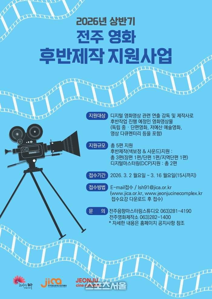 [스포츠서울 ㅣ 전주=고봉석 기자] (재)전주정보문화산업진흥원(이하 진흥원, 원장 허전)과 전주영화제작소는 오는 3월 16일까지 대한민국 독립영화 제작 환경개선과 우수 작품을 발굴하기 위한 ‘2026년 상반기 전주 영화 후반제작지원 사업’에 참여할 작품을 공개 모집한다고 23일 밝혔다.