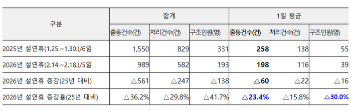 (교통사고 감소) 이번 설 연휴 교통사고 관련 하루 평균 출동 건수는 198건으로, 전년(258건) 대비 23.4% 감소했다. 이는 연휴 시기가 1월 하순에서 2월 중순으로 이동하면서 폭설이나 강추위 등 겨울철 악천후의 영향이 상대적으로 완화된 점이 크게 작용했다. 또한, 설날 전 연휴 기간이 길어 귀성 차량 이동이 일정 부분 분산된 것도 사고 감소의 복합적 원인으로 분석된다.