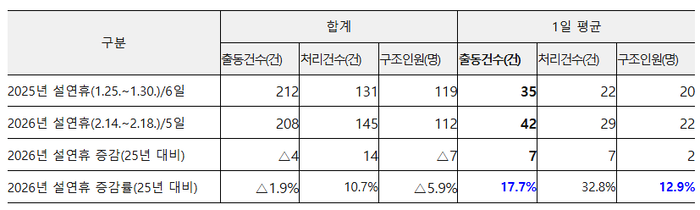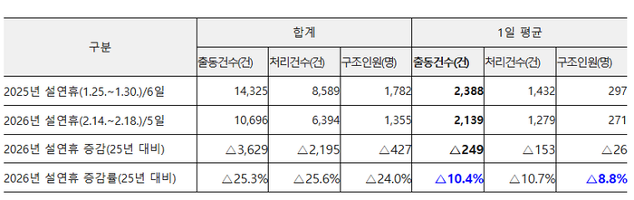 (전체 구조활동 감소) 2025년 설 연휴(6일간)와 비교한 결과, 올해 하루 평균 구조 출동은 249건(10.4%) 감소하였고, 구조 인원 또한 26명(8.8%) 줄어들어 전반적인 구조 수요는 감소한 것으로 나타났다.