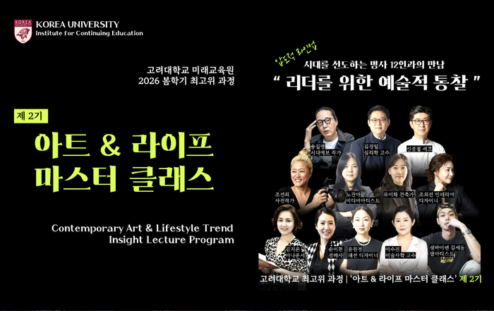 문정빈 고려대학교 미래교육원장은 “예술과 라이프스타일에 대한 통합적 이해는 조직과 개인 브랜드 가치를 확장하는 핵심 자산”이라며 “본 과정은 지식 전달을 넘어 리더들이 예술적 영감을 통해 새로운 가치를 창출하고 수준 높은 네트워크를 형성하도록 돕는 데 목적이 있다”고 밝혔다.