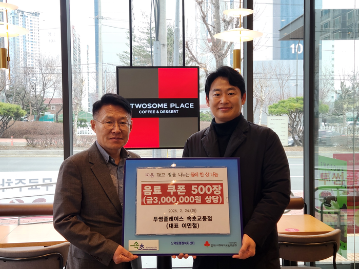 [스포츠서울ㅣ김기원기자]투썸플레이스 속초교동점 이민철 대표는 2월 24일, 노학동지역사회보장협의체 특화사업인 ‘둘레 한 상 나눔 사업’을 통해 300만 원 상당의 음료 쿠폰 500장을 지역 내 청소년에게 후원하며 함께 사는 노학동 만들기에 동참했다.