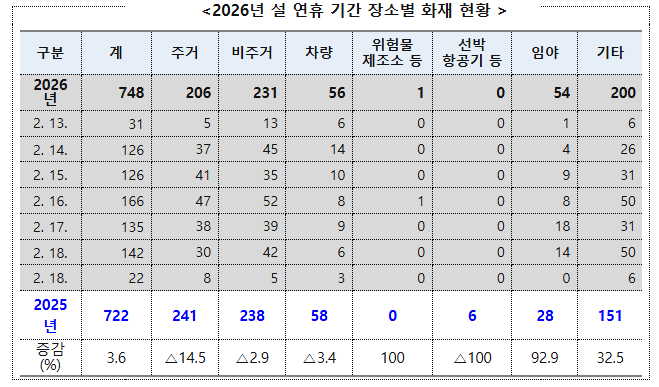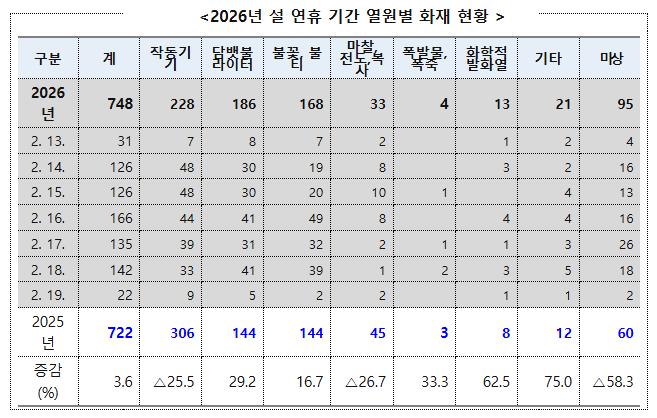 통계에 따르면 올해 설 연휴 기간 전국에서 발생한 화재는 총 748건으로 전년(722건) 대비 3.6%(26건) 소폭 증가했다.