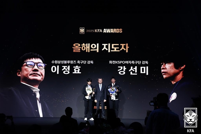 올해의 지도자상은 이정효(수원 삼성·남자), 강선미(화천KSPO·여자) 감독이 받았다. 이 감독은 지난해까지 광주FC를 이끌며 탁월한 전술 운영을 바탕으로 시도민구단 사상 첫 AFC 챔피언스리그 엘리트 8강 진출을 이뤄냈고, 코리아컵 준우승도 차지했다. 강 감독은 감독 부임 첫 해 화천KSPO를 전국여자축구선수권, 전국체전, WK리그 우승으로 이끌었다.