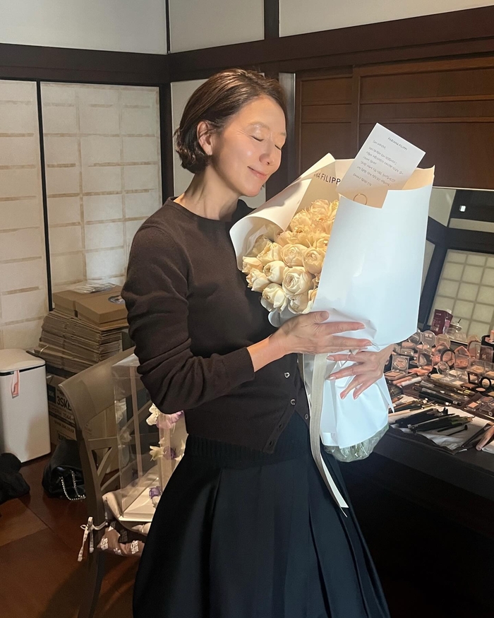 김희애는 수많은 메이크업 도구가 놓인 화장대 앞에서도 꾸밈없는 모습 그대로 꽃을 응시했다. 잡티 하나 없이 매끄러운 피부 결은 그가 평소 얼마나 철저하게 자신을 관리해 왔는지를 짐작하게 한다.