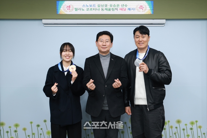 〔스포츠서울│용인=좌승훈기자〕이상일 용인특례시장은 24일 시장실에서 2026 밀라노·코르티나 동계올림픽 스노보드 평행대회전 은메달을 획득한 김상겸 선수와 스노보드 빅에어에서 동메달을 획득한 유승은 선수를 초청해 축하의 인사를 전했다.