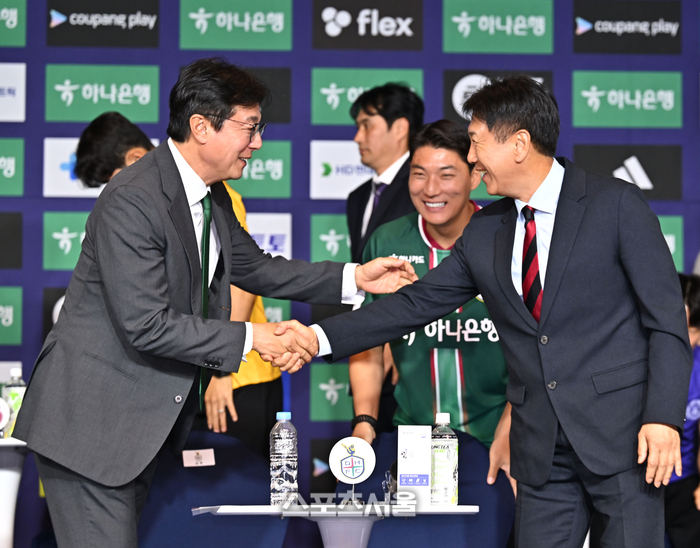 대전 하나 황선홍 감독과 포항 박태하 감독이 25일 서울 홍은동 스위스 그랜드 호텔에서 열린 K리그 2026 개막 미디어데이후 악수를 하고 있다.