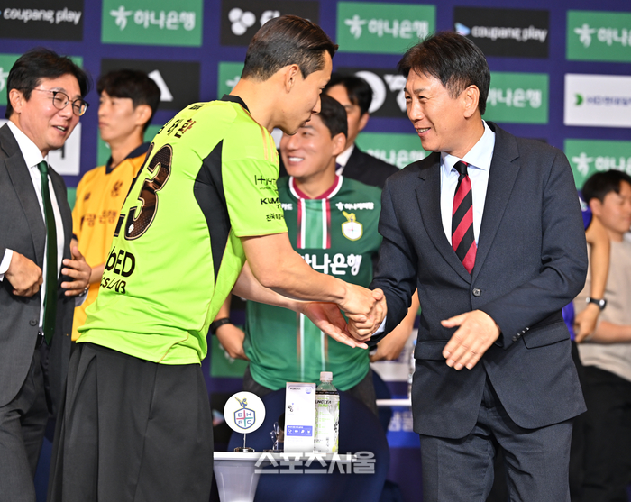 포항 스틸러스 박태하 감독이 25일 서울 홍은동 스위스 그랜드 호텔에서 열린 K리그 2026 개막 미디어데이 후 전북 김태환과 악수를 하고 있다.