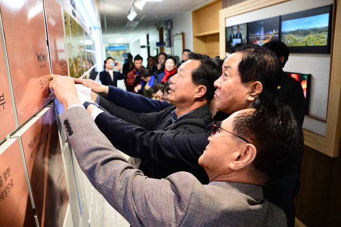 먼저, 군청 2층 복도에 있는 오프라인 명예의 전당은 고액 기부자(1천만 원 이상)를 위한 전용 공간으로 재설계되었다. 기존의 동판 부착 형태의 정체성은 유지하면서도, 공간 효율성을 극대화한 현대적 디자인을 적용해 기부자의 자긍심을 높였다.