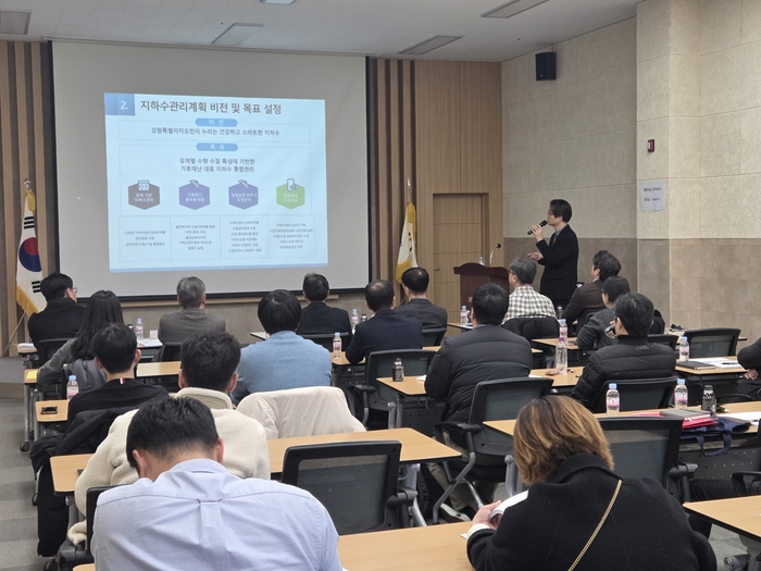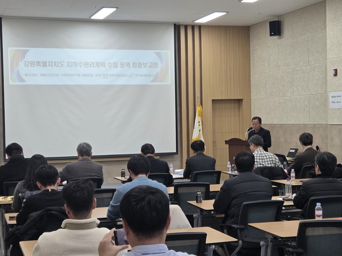[스포츠서울ㅣ춘천=김기원기자]강원특별자치도(도지사 김진태)는 2월 25일(수) 한국기후변화연구원에서 도 및 시군 지하수 담당 공무원과 지하수관리위원회 위원 등이 참석한 가운데 「강원특별자치도 지하수관리계획(2026~2035) 수립 용역」 최종보고회를 개최하고 계획 수립 결과를 공유했다.