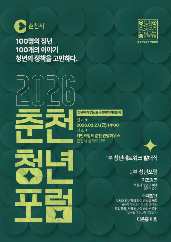 춘천시(시장 육동한)가 27일 커먼즈필드 안녕하우스에서 ‘2026 춘천시 청년네트워크 발대식 및 청년포럼’을 개최한다. 시는 앞서 공개 모집을 통해 제1기 청년네트워크 위원 30명을 선발했다. 이번 행사는 청년이 정책의 수혜자를 넘어 설계자로 참여하는 소통 창구를 공식화하고 ‘청년이 머무는 도시, 춘천의 미래전략’을 모색하기 위해 마련됐다.