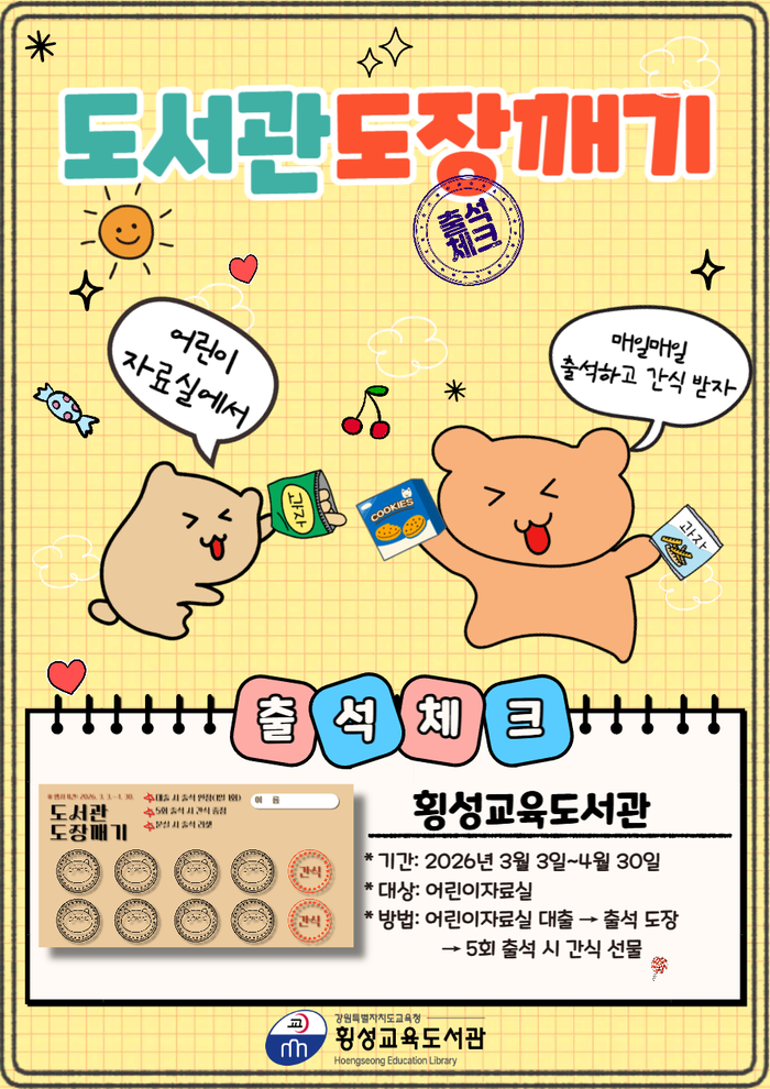 [스포츠서울ㅣ김기원기자]강원특별자치도교육청 횡성교육도서관(관장 권정애)은 3월부터 4월까지 어린이들의 도서관 이용 활성화와 독서 습관 형성을 위해 어린이자료실 출석 체크 ‘도서관 도장깨기’를 운영한다고 밝혔다.