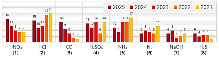 (주요 사고 물질) 사고를 가장 많이 일으킨 ‘단골 물질’은 강한 산성이나 염기성을 띠는 물질들이었다. 질산(HNO3), 염화수소(산)(HCl), 황산(H2SO4) 등 ‘산성 물질’과 암모니아(NH3), 수산화나트륨(NaOH) 등 ‘염기성 물질’의 사고 빈도가 여전히 높았으며, 황화수소(H2S), 일산화탄소(CO)와 같이 저농도에서도 인명에 치명적인 ‘유독가스’로 인한 질식 사고도 빈번했다.