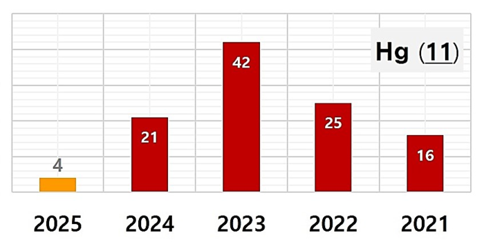 반면, 그동안 학교 실험실 등에서 잦은 사고를 일으켰던 액체 중금속 ‘수은(Hg)’과 ‘포르말린(aq. HCHO)’은 교육기관 중심의 안전관리 강화 노력에 힘입어 사고 빈도가 눈에 띄게 감소하는 성과를 보였다.