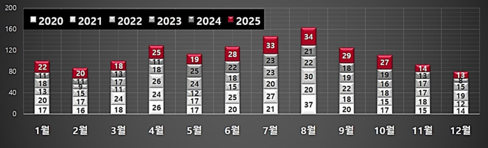 (계절별 특성) 화학사고 발생 시기는 기온이 높은 여름철에 집중되는 경향을 보였다. 월별 분석 결과, 기온이 낮은 동절기(11월~3월)보다 하절기(6월~10월)에 사고가 훨씬 잦았으며, 특히 무더위가 절정인 7월(33건)과 8월(34건)에 사고가 집중된 것으로 나타났다. 이는 높은 기온이 화학물질의 휘발성을 증가시키고, 저장 용기 내부 압력을 상승시키는 등 물리‧화학적 특성 변화에 영향을 미친 것으로 풀이된다.