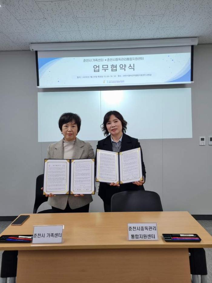 [스포츠서울ㅣ춘천=김기원 기자]춘천시중독관리통합지원센터(센터장 정숙자)와 춘천시가족센터(센터장 윤은희)가 26일 중독 문제가 있는 다문화가정의 조기 개입 및 회복 지원을 통한 건강한 지역사회 조성을 위해 업무협약(MOU)을 체결했다.