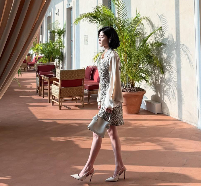 그는 광택이 도는 샴페인 골드 컬러의 셔츠에 화려한 패턴의 시퀸 드레스를 레이어드해 세련되면서도 화려한 매력을 뽐냈다. 여기에 턱선까지 오는 깔끔한 단발머리는 그녀의 뚜렷한 이목구비를 더욱 돋보이게 하며 한층 깊어진 성숙미를 드러냈다.